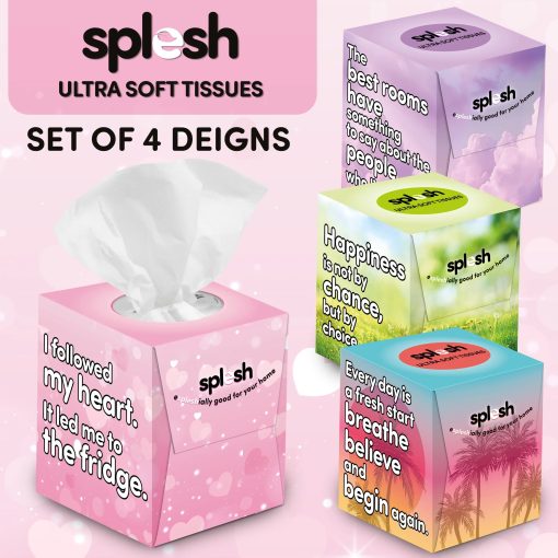 Thoughtfully Designed:?Stylish cube tissue boxes feature 4 unique inspirational designs, great for having in each room of the house. Whether you’re starting your day, relaxing at home, or sharing a laugh, Splesh adds a little meaning to every moment.